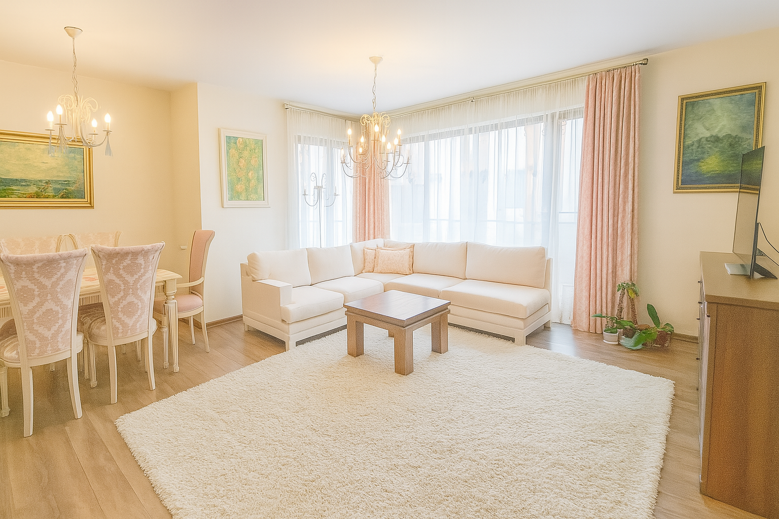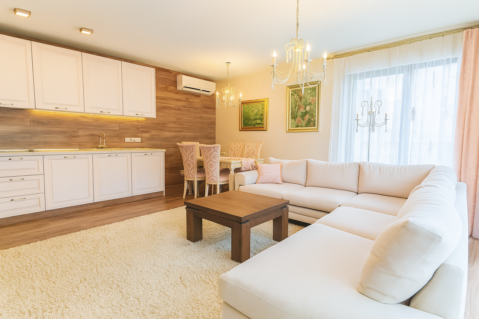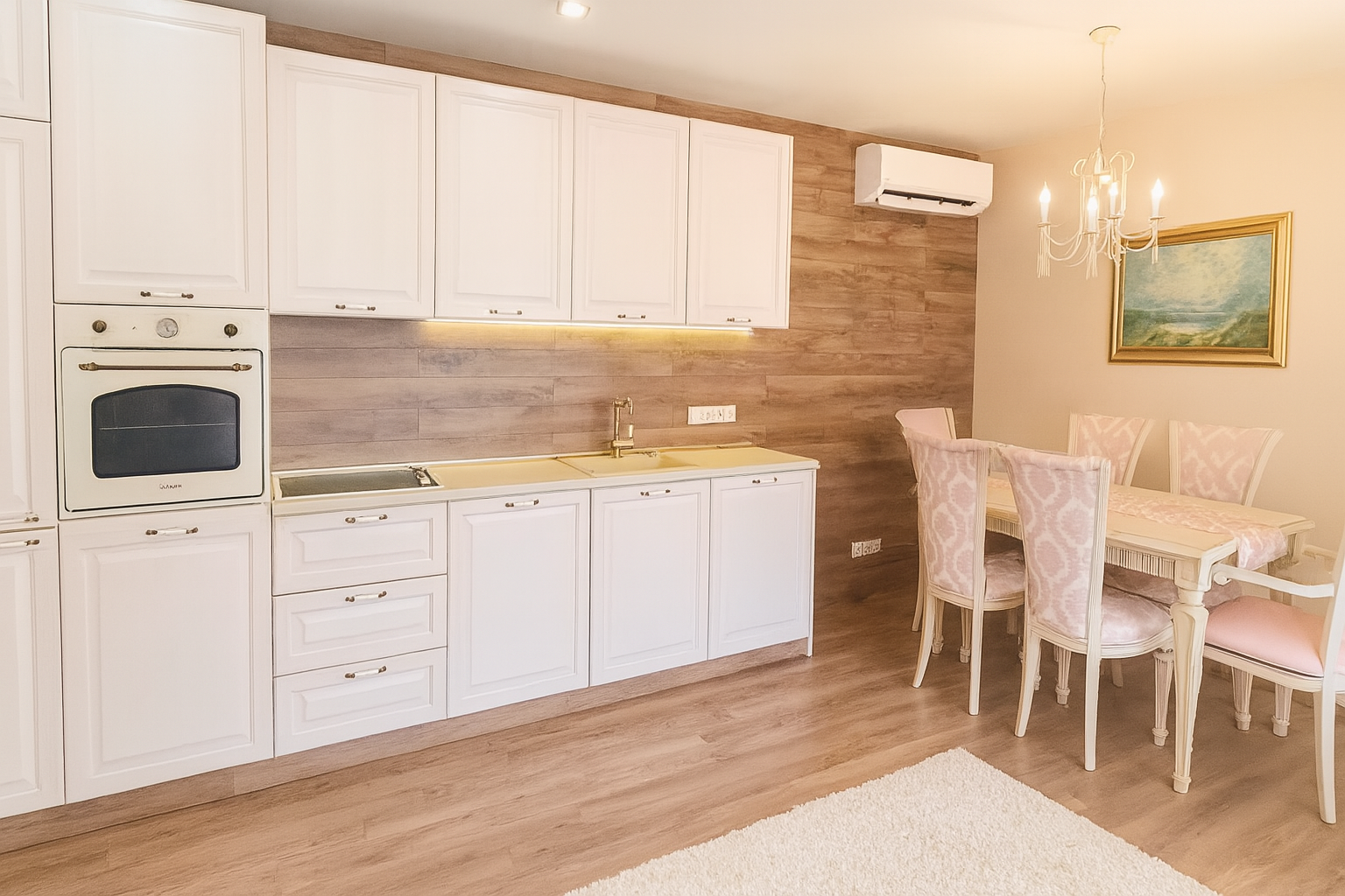 Апартаментът съчетава съвременен комфорт и ретро акценти, създавайки уютна атмосфера и усещане за стилна симбиоза между минало и настояще.