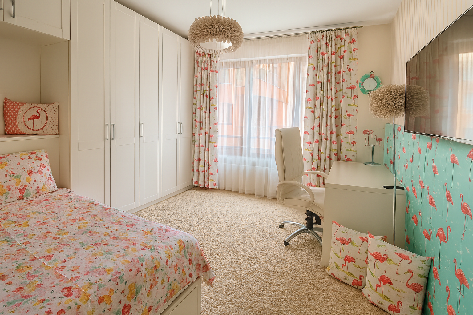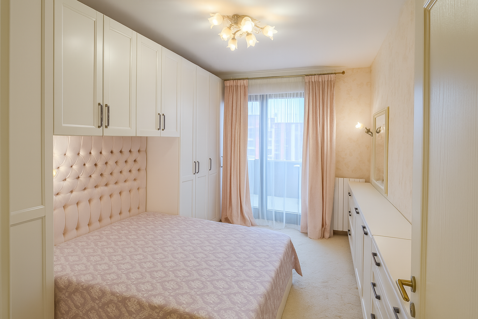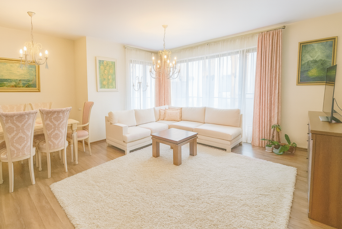 Апартаментът съчетава съвременен комфорт и ретро акценти, създавайки уютна атмосфера и усещане за стилна симбиоза между минало и настояще.